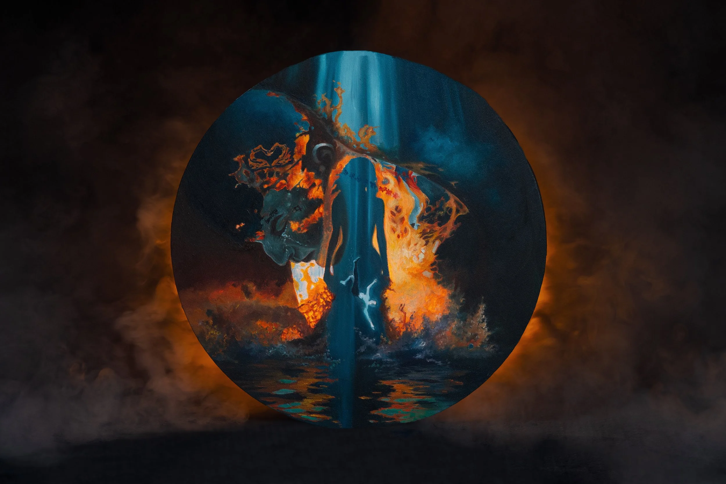I wanted to reflect that contradiction - how vulnerability, chaos, and healing can coexist. The figure stands in a stream of calm light while being consumed by fire, symbolizing the emotional cost of expression. The second figure is drowning, slowly consumed by the water - symbolising how artists allow themselves to be lost in the process.