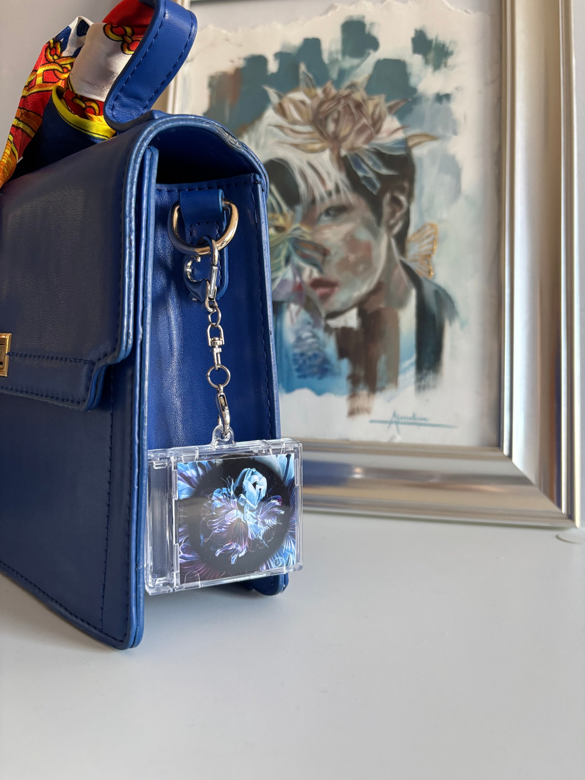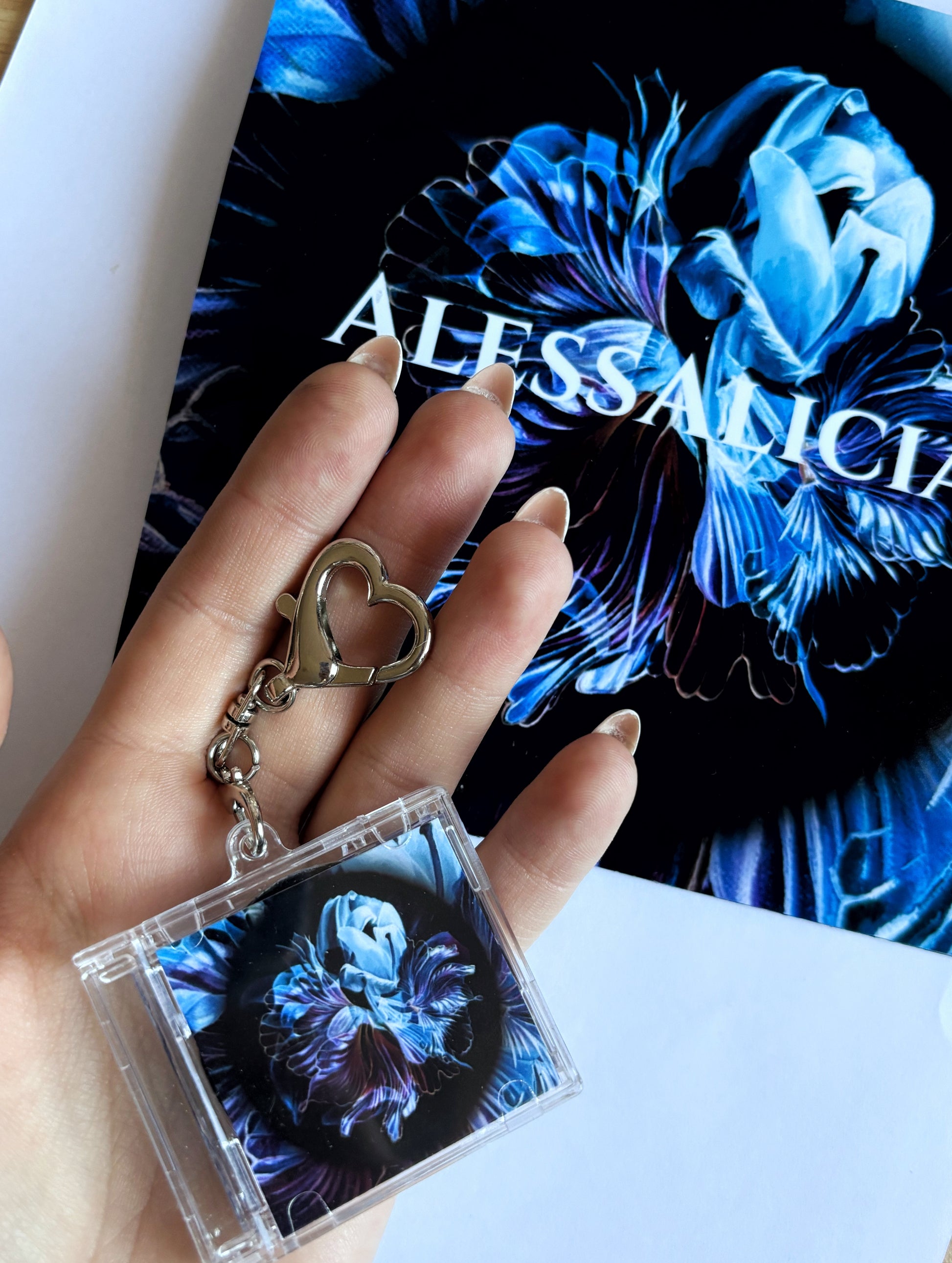 Once you open the keychain, you’ll see a part of the lyrics, as well as the mini disc covered with my painting. The disc is removable. On the reverse, you can see the series number of your print.
